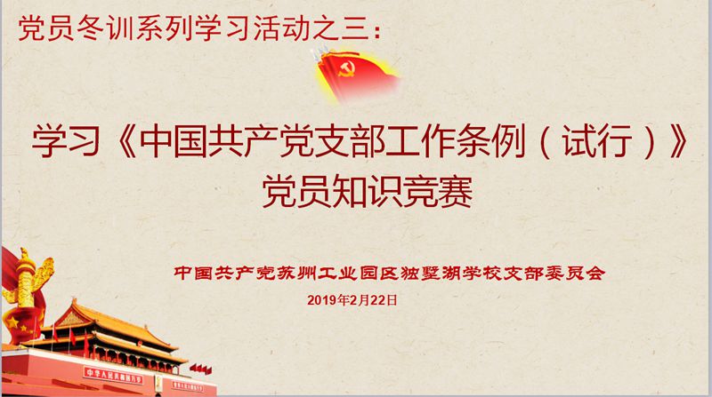 为进一步引导广大党员教师深刻理解掌握中央印发的《中国共产党支部工作条例(试行)》内容,全面加强党支部建设,也为了丰富冬训活动形式,学校支部于近期组织全体党员进行了相关内容的知识竞赛。