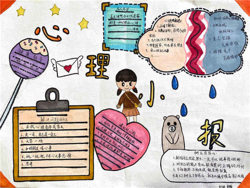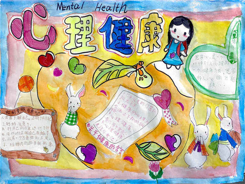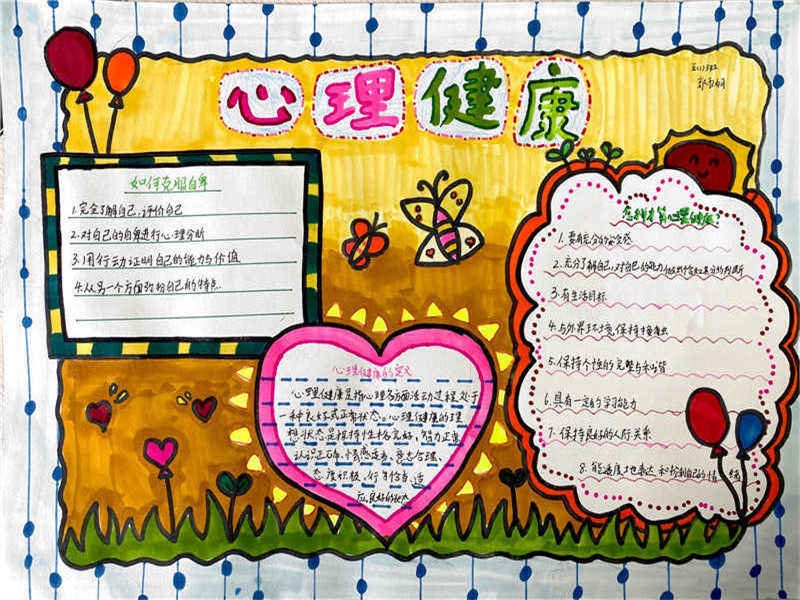 同学们在心理健康老师和班主任老师的指导下,阅读有关心理健康知识、小报、宣传资料,学习了一些自我调节的方法,把所思所想以手抄报的形式呈现,用色彩描绘美丽心灵,用画笔编织美好未来,充分展示了学校心理健康教育的特色,也抒发了同学们追求阳光灿烂美好生活的愿景。