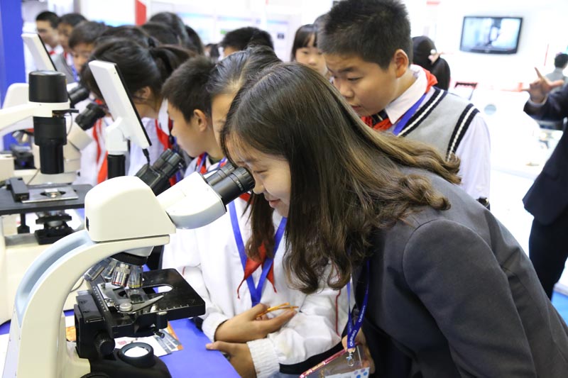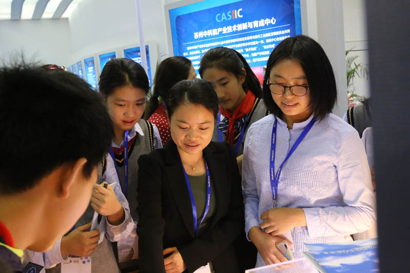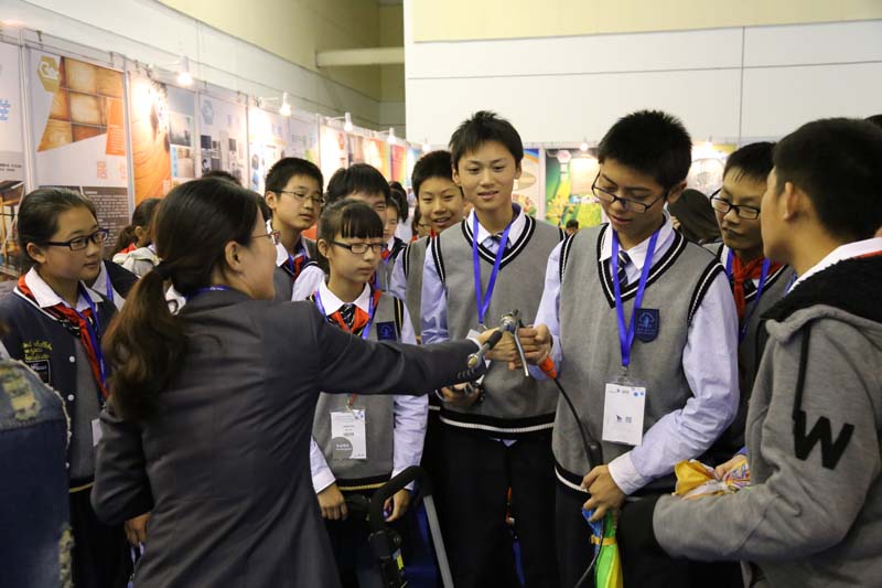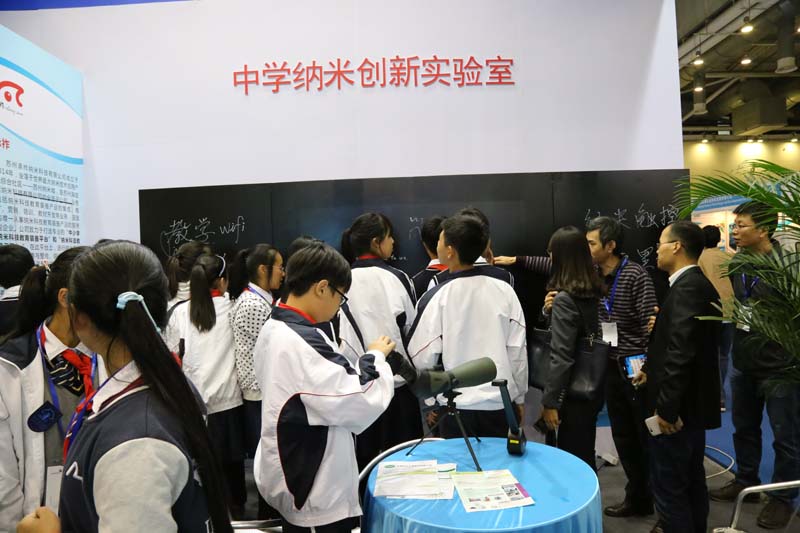 有序的进入展馆后,同学们对呈现在眼前的各种高科技产品产生了浓厚的兴趣。他们围在中学纳米创新实验室前认真听讲,在工作人员的讲解下尝试操作纳米显微镜及纳米黑板,不时会响起惊喜的笑声;在伊朗纳米展台前,他们被伊朗工作人员对纳米结构的风趣解说吸引了,不觉间围成了一个圈。当看到在伊朗展台的电子显示牌上出现独墅湖学校纳米活动剪影时,同学们感到了莫大的惊喜与骄傲。在参观的过程中,同学们不停地看,不停地听,也在不停地探索研究。走出展览馆,他们手里已经收集了很多参观的资料,郑重地说要回去继续研究。