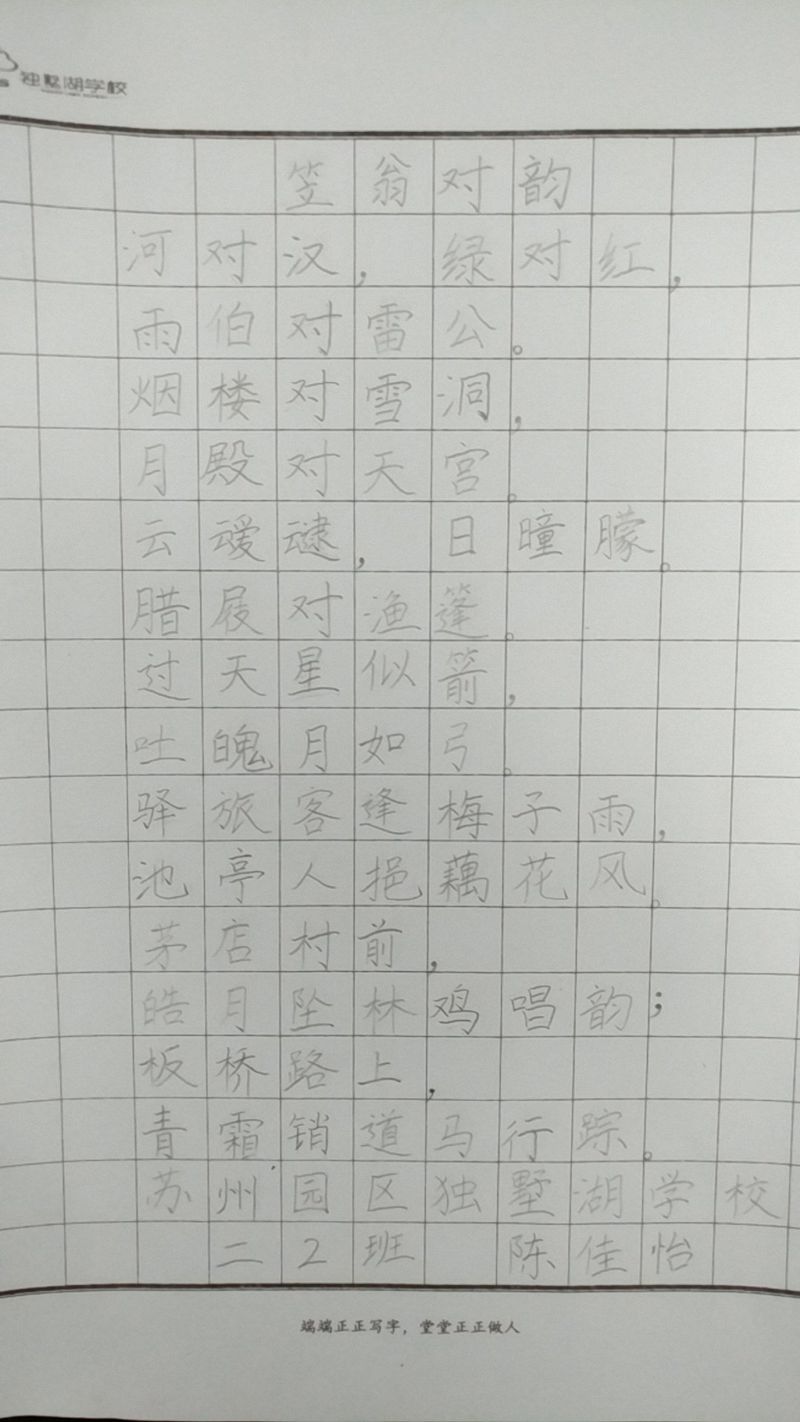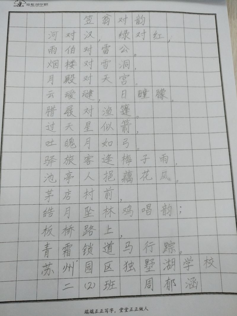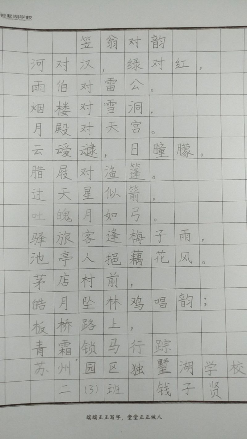 汉字是世界上最奇妙的表意文字之一,书法则是表现汉字美、代表中华文化精髓的传统艺术。为了传承中华书法文化,激发学生写字、练字的兴趣,培养学生规范书写美观汉字的能力,帮助学生养成良好的书写习惯,独墅湖学校在近期举行了二年级整班硬笔书法比赛。