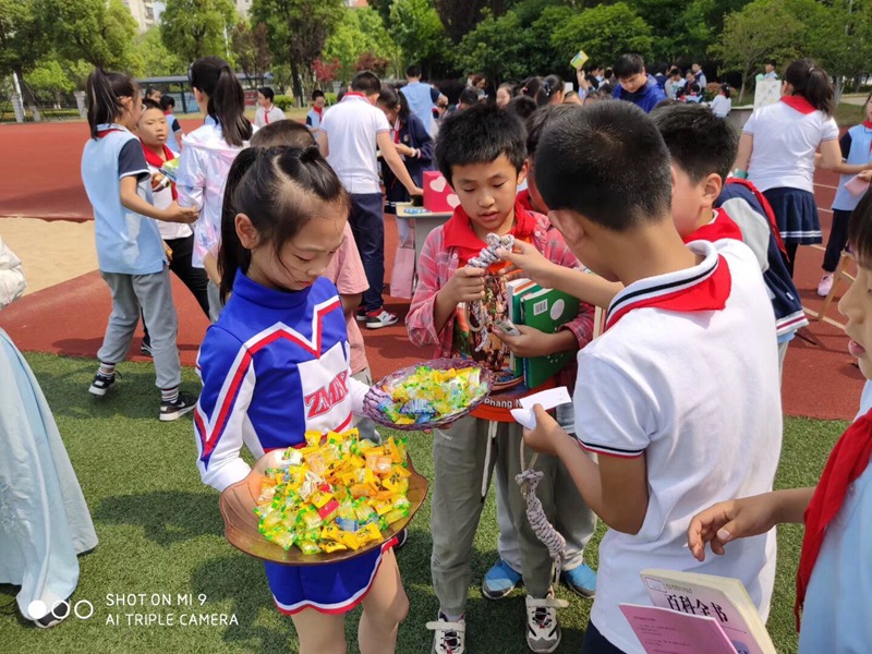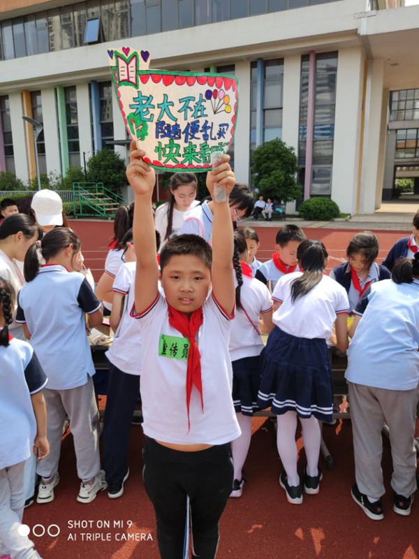 义卖现场,人头攒动,热闹非凡。销售员为了让班级的好书能够畅销,也使出浑身解数。瞧,“满十抽奖,多买多送!”“买两本送练习本”“春风十里,不如好书一本!”“你买的不是商品,是爱心!”“让好书漂流,让快乐分享,让爱心传递”……光是这些动情的文字已让人满心欢悦。