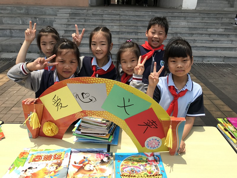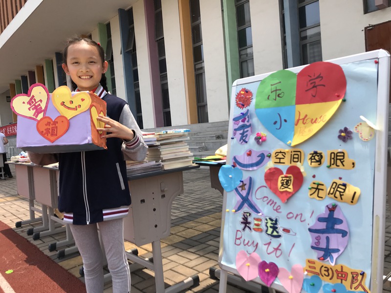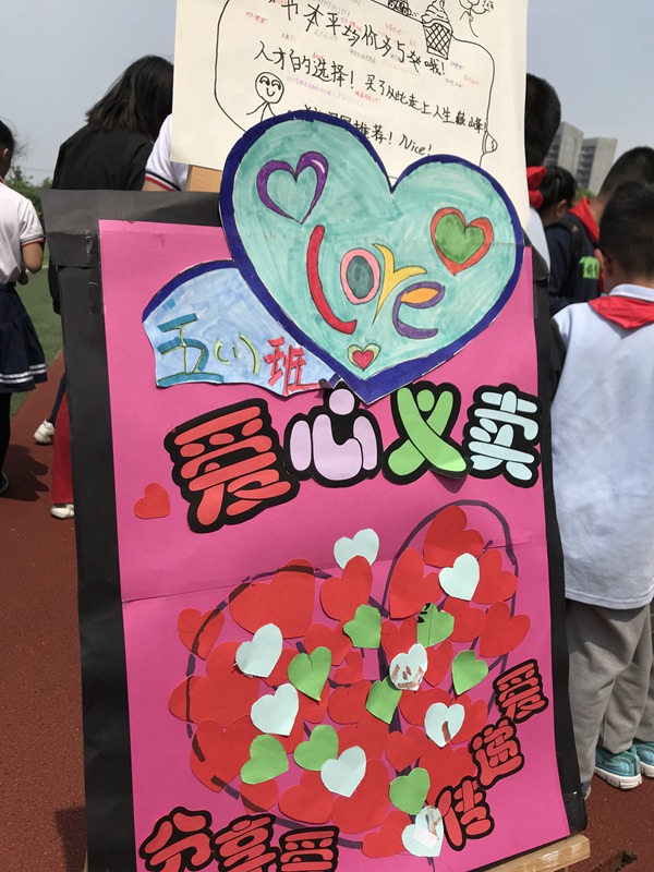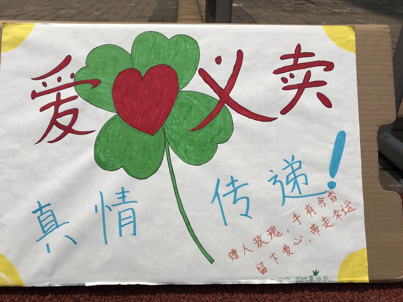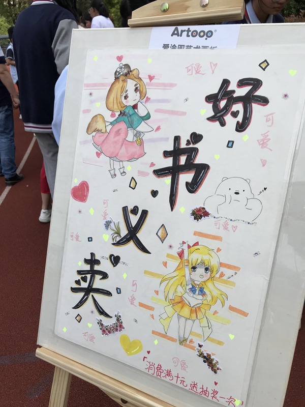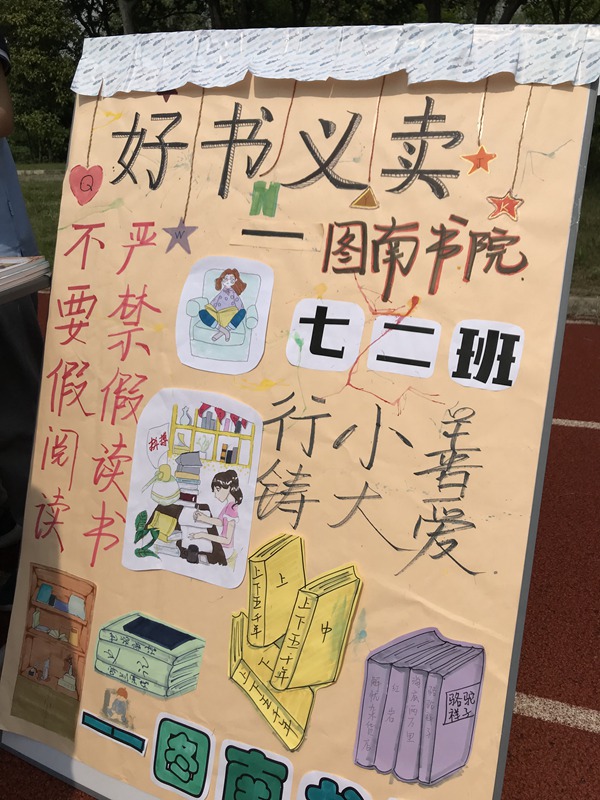 活动当天学生们精心设计的一幅幅“宣传海报”、“义卖口号”成了义卖活动中一道亮丽的风景线。各班精心布置了自己的“义卖”摊位——“新苗书屋”“奇妙书店”“年轮书屋”“书童小屋”……
