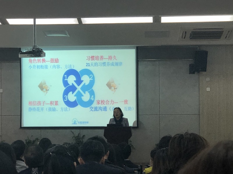 接着,孙向梅副校长以“携手共进,让梦启航”为主题,与家长进行了交流。孙向梅副校长从办学理念入手介绍了学校办学情况,随后就角色转换、习惯养成、相信孩子和家校合力四个方面与家长一起探讨交流:她强调,要以鼓励为主,帮助孩子尽快适应初中生活;家长耐心督促孩子养成好习惯,孩子将受益终生;同时要相信孩子,给孩子一个合理的成长周期;她指出:当碰到教育难题的时候,家校并肩携手,同心协力更好地解决问题。