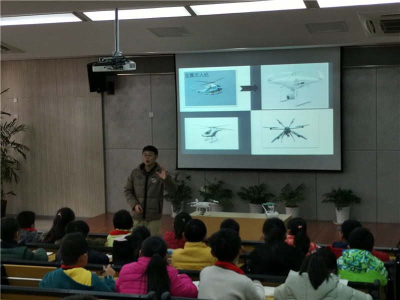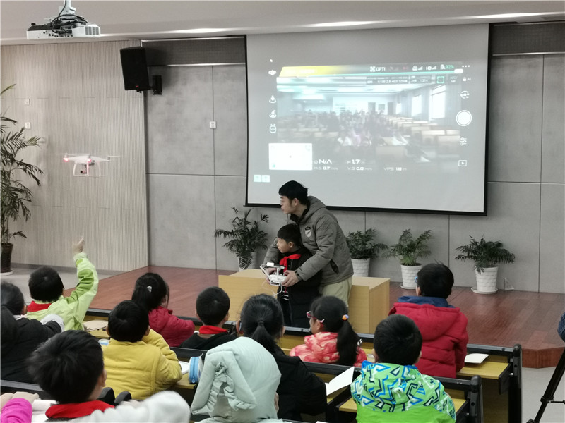 早在一百多年前,人们就已经发明了飞机,征服了天空,无人机在这之后才逐渐产生……讲座现场,陈老师通过一则影片追溯历史,带领孩子们了解了第一架无人机的产生。接着,陈老师用轻松幽默的语言,就无人机的一系列问题为同学们做了详细的解说。翼龙、彩虹四号、攻击-1型无人机、WJ-600……一大波无人机来袭,孩子们应接不暇,听得意犹未尽,对无人机世界也因此充满了无限的期待和想象。兴意正浓时,陈老师还指导学生现场进行了无人机操控飞行,在孩子们的操控中,无人机慢慢起飞、盘旋、上升、来去自如,引得大家的阵阵欢呼。
