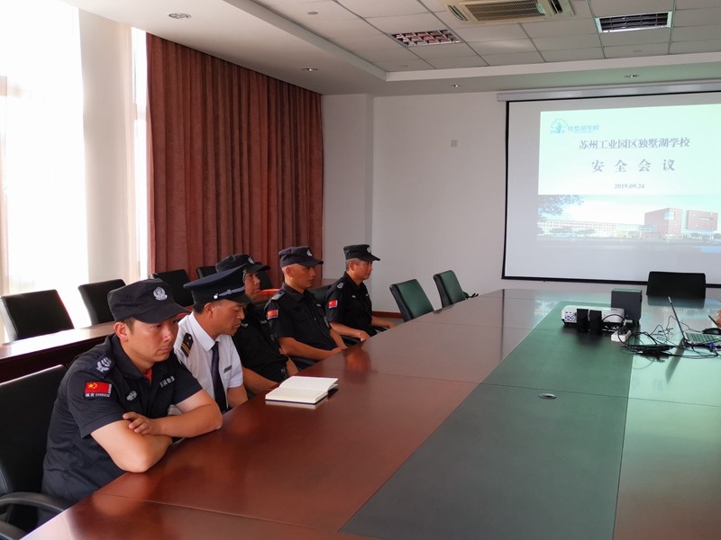 为进一步提高安全管理水平,把安全工作落到实处,切实保障广大师生生命财产安全,9月24日上午,苏州工业园区独墅湖学校召开安全工作推进会议,布置安全任务,落实安全细节,扫除安全盲区。校长室、安保处、总务处以及全体保安人员参加会议。