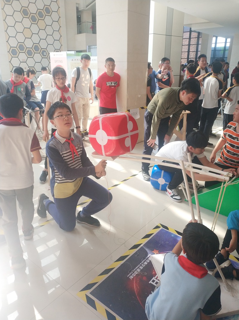 在“智造未来”机械创新项目中,吴逸飞团队利用PVC管、KT板与橡皮筋,制作了一个大型投石战车,最终顺利完成比赛得分任务荣获小学组一等奖。