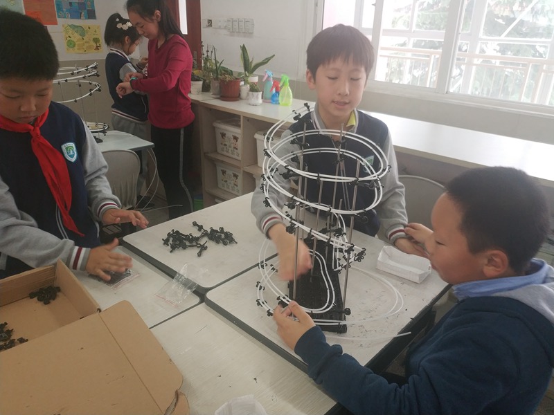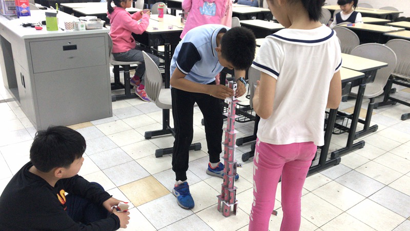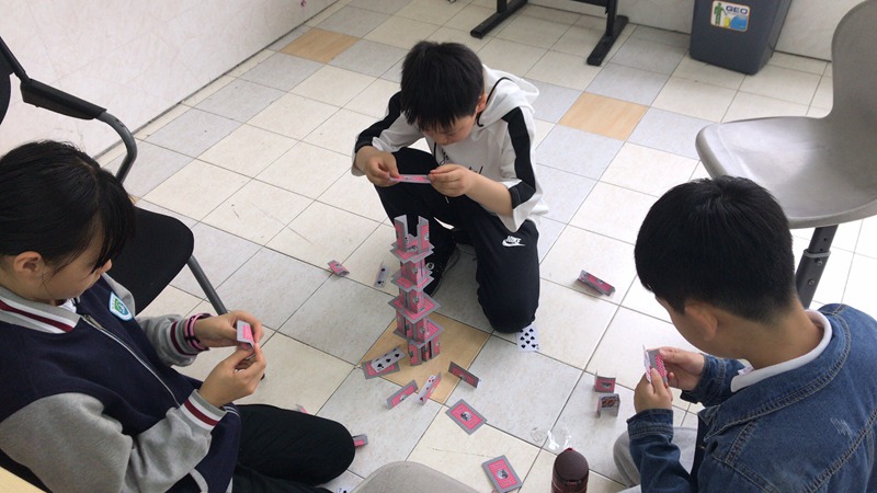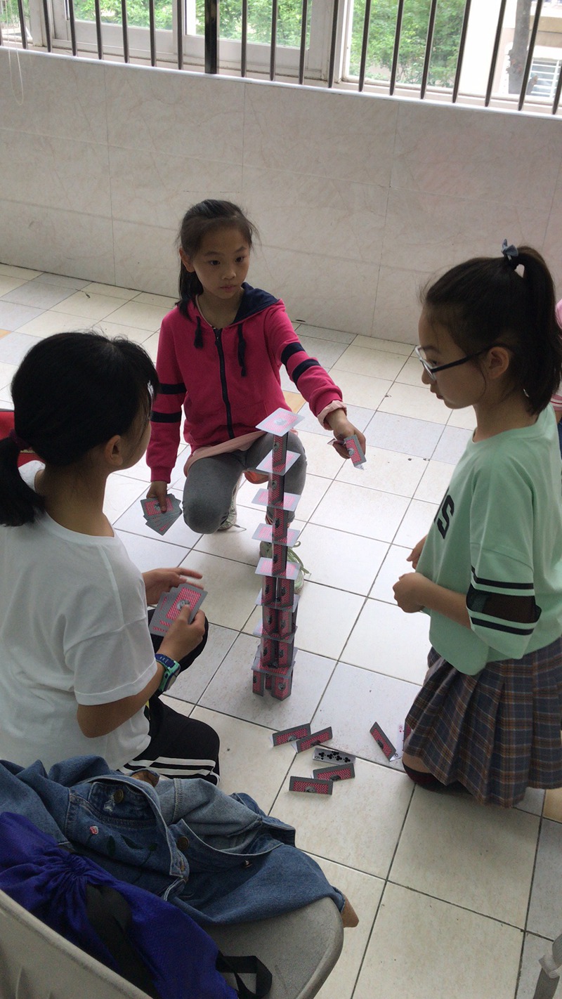 不单单是过山飞车,在纸牌搭建项目我们的同学更是不逞多让。同学们沉着冷静地利用这一张张纸牌不断垒高垒高再垒高,撘出了纸牌界的极限高度。这对他们的细心和耐心是一个巨大的考验,但是同学们用他们的行动证明了他们可以。最终来自三年级的张梓欣、王瀚宇、陆俊翔小组和来自四年级的赵心一、胡晨宇、朱炎镓小组,在众多比赛小组中脱颖而出获得了一等奖。