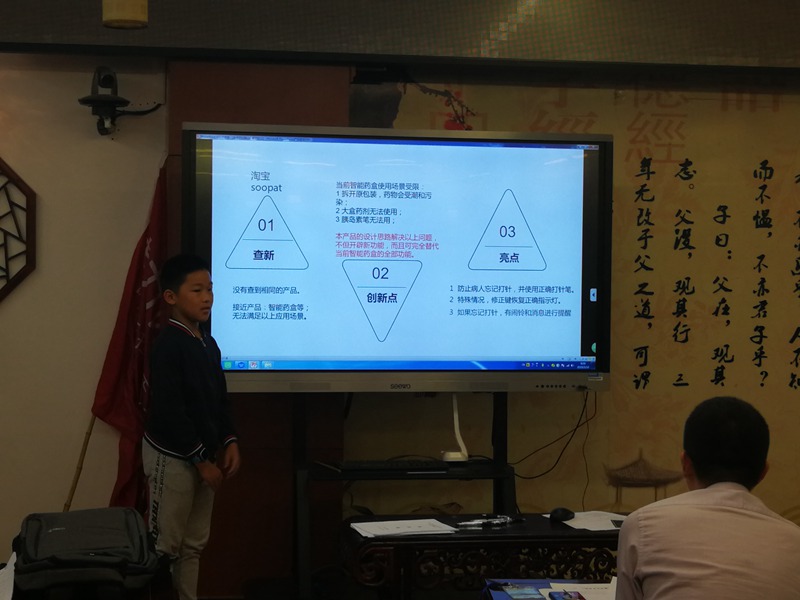 最后在在科技创意金点子比赛中,我校的创新小达人姜致远同学带着自己的新创意《一种具有记忆与提示功能的胰岛素笔盒》,在各位评审专家面前流畅讲述着自己的发明与想法,赢得了评委们的称赞也斩获了一个一等奖。其他两位创新达人苏翡、王烁也分别凭借自己的作品《安全头盔纳米银膜电加热防雾》、《不脏手的墨水瓶》获得二等奖。