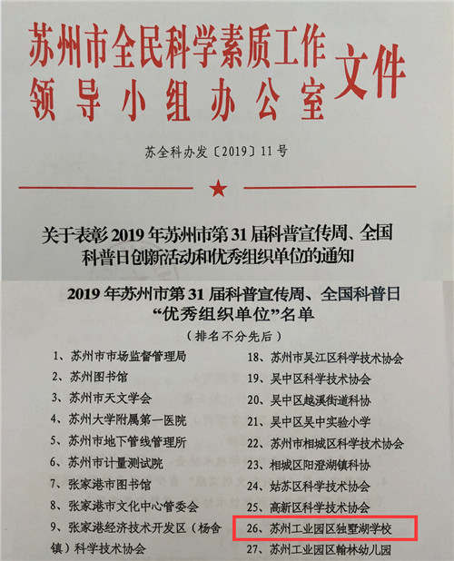 近日,苏州市全民科学素质工作领导小组办公室表彰了一批在全民科普、提高全民科学素质作出突出贡献的项目和单位,园区包括苏州工业园区独墅湖学校在内的3家单位位列其中,荣获2019年苏州市第31届科普宣传周、全国科普日“优秀组织单位”称号!