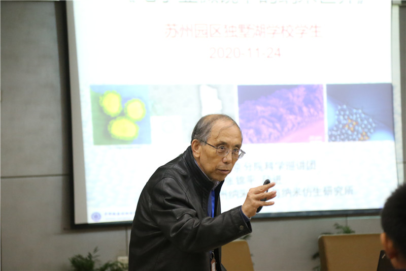 张锦平教授现任中国科学院苏州纳米技术与纳米仿生研究所研究员,是该所测试平台电子显微镜实验室主要创建人。讲座开始,张教授从孩子们感兴趣的冠状病毒开始,深入浅出地向独墅学子们介绍了“微米”“纳米”的概念,继而他又结合图片,将电子显微镜下的神奇世界娓娓道来。浅显易懂的语言,生动活泼的讲解让同学们大开眼界!大家不禁感叹:原来科学是如此的有趣和“接地气”!最后张教授借用自己导师以及钱学森教授的典例,对独墅湖学校的同学们寄予厚望:认认真真做学问,老老实实做人。