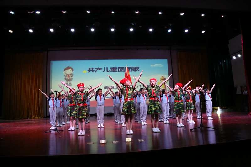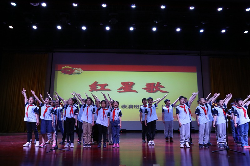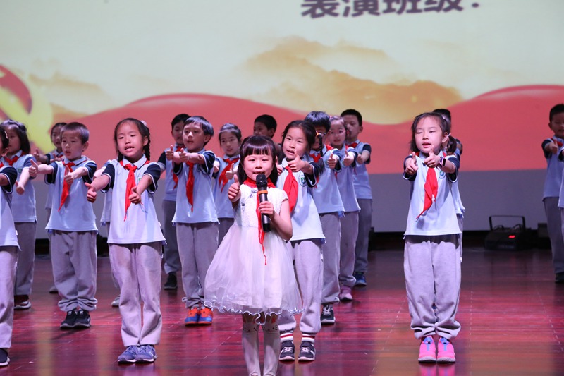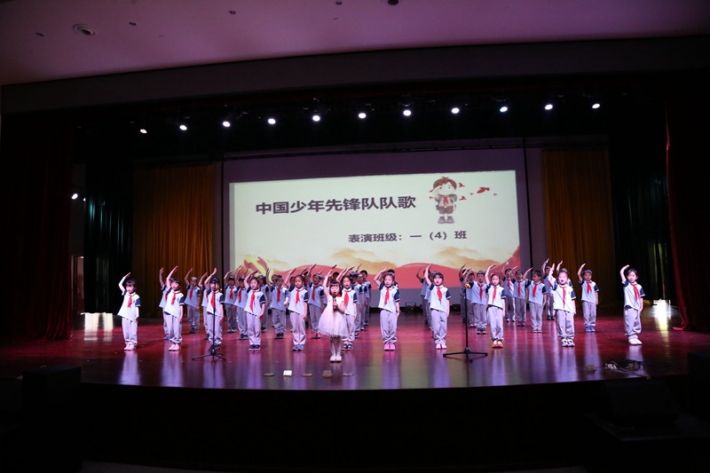 比赛中,伴着两位主持人激情澎湃的言语,一段回顾建党建国宏伟壮丽的历程开场白拉开了整场比赛的序幕。瞧,朝气蓬勃、精神饱满的一(4)班的同学们给我们带来了一首《中国少年先锋队队歌》,小朋友们用稚嫩的歌声唱出了他们带上红领巾的自豪感;