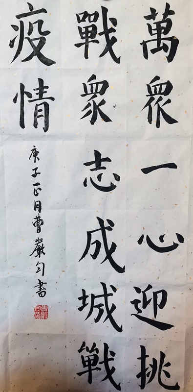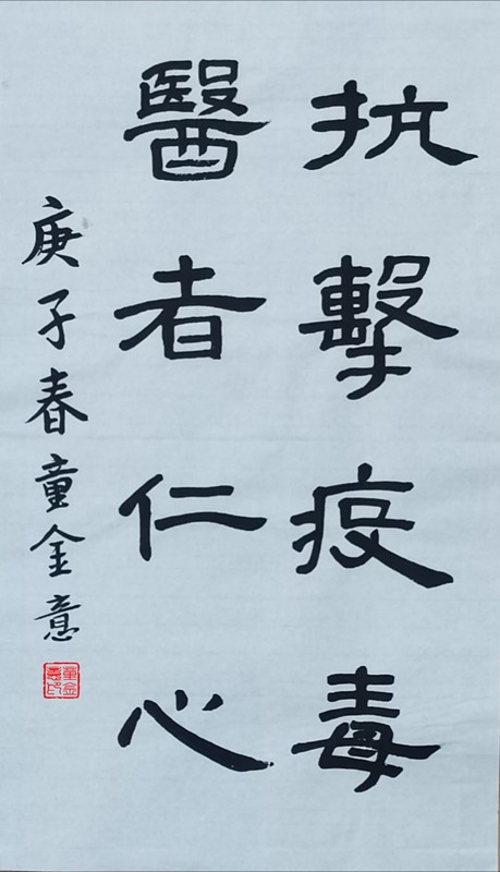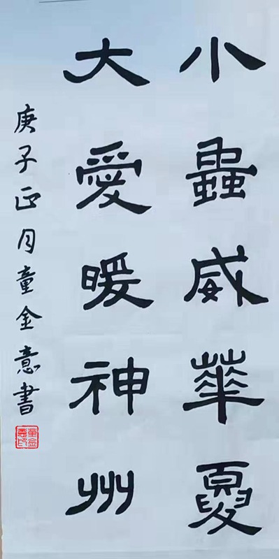 其中七(1)班童金意同学的两幅书法作品《小虫威华夏,大爱暖神州》分别入选“致敬英雄众志成城”苏州青少年心系疫区网络主题展。
